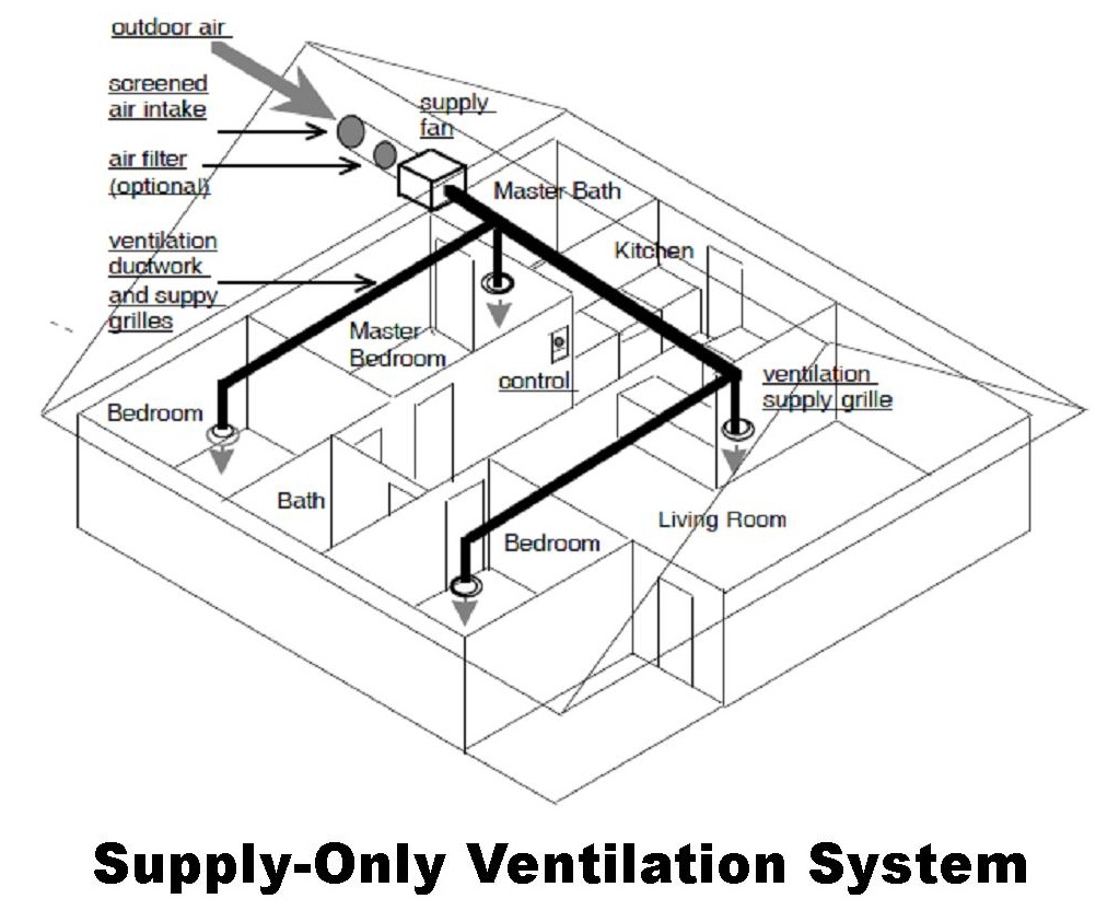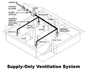 Supply-only ventilation works exactly opposite of exhaust-only ventilation. They draw air in from known locations to push stale air through the accidental holes in the shell. In some places, this is okay. In colder climates, warm, moist air is forced into the walls, floors, and ceiling, where water vapor may condense and freeze. The result can be pre-mature deterioration.